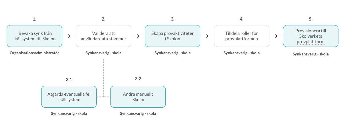 Att provisionera användardata till Skolverkets provplattform görs i fem steg enligt nedan. Beroende på skolhuvudmannens storlek kan rollerna vara en eller flera personer.